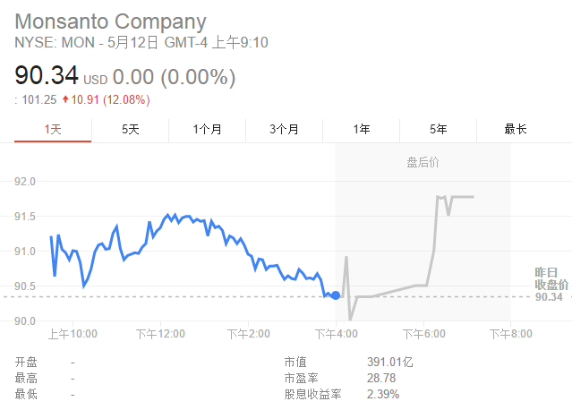 孟山都盘前股价一度大涨近18%,现在涨幅已缩窄。