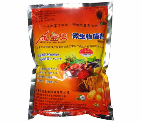 金宝贝微生物菌肥是根据植物营养生理学和根际土壤微生态学原理,由军科院、农科院研发,北京华夏康源科技有限公司自主投资开发策划并组织全国市场营销的第五代高新科技产品。正确施用本品,能使经济作物增产30%,大田作物增产10%,降低化肥用量、降低生产成本、改良土壤结构、消除土壤板结、改善作物品质、提高商品率,最终显著提高经济效益,是绿色食品理想的生产资料。第一代老产品曾于1997年首批获农业部微生物肥料登记证,早在1994年就获得全国"两高一优"农业新技术金奖、1996年中国杨陵农业科技博览会金奖、以及后来的系列大奖,经全国二十几个省市 自治区十多年推广应用,效果显著,深受广大用户欢迎,是国内微生物菌肥、生物肥领域的太师级产品(微生物工程技术研发始于1937),是军工技术农用的成功杰作。有效功能活菌数远高于国标,尤其是产品外观有重大突破,包装更可爱、更人性化,因而更好卖、更好用,更符合市场需求。