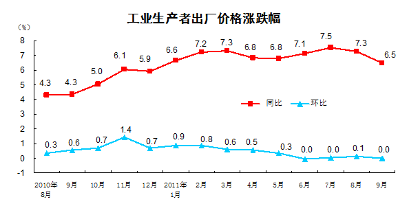 2011年9月份,全国工业生产者出厂价格与上月持平,比去年同月上涨6.5%。工业生产者购进价格比上月上涨0.1%,比去年同月上涨10.0%。2011年1—9月,工业生产者出厂价格平均同比上涨7.0%,工业生产者购进价格平均同比上涨10.4%。