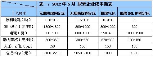 今年我国尿素企业装置仍以燃煤工艺为主,所占比例接近行业的80%。因此,笔者重点分析煤头尿素企业的成本构。对于尿素这一能源转化类产品而言,燃煤支出必然是其最主要的成本构成,其次便是耗电、动力蒸汽、人员以及装置折旧等。这其中,由于选择工艺的不同,成本也有一定差异。目前,较为成熟的生产工艺包括:无烟块煤固定床、无烟粉煤制块固定床、粉煤气化三种,成本分布介于1800-2250元的跨度之间。无烟块煤成本最高,达到2100-2250元;无烟粉煤次之,达到2050-2100元;粉煤气化最低,生产一吨尿素的完全成本仅为1800元。就全国尿素装置构成而言,无烟块煤企业大概占国内尿素总产能的58%;后两种工艺约占总产能的22%。另外,还有一种今年才逐渐被大家认识的工艺——褐煤BGL炉固定床。虽然由于褐煤造气存在一定问题,致使相关企业暂未正式投产,但其1500元的成本预算足以引起业内关注。