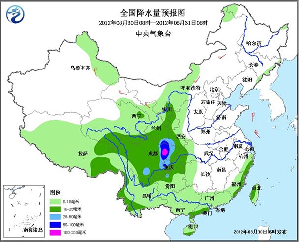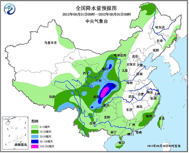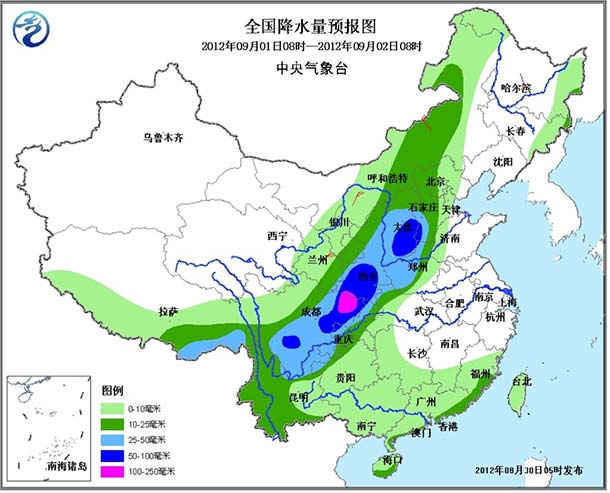 30日至9月2日,宁夏大部、甘肃东部、四川中东部、陕西中南部、山西中南部、河北西南部等地自西向东有大到暴雨,其中,陕西南部、四川盆地北部局地有大暴雨,过程雨量可达80-160毫米,局地180-250毫米。