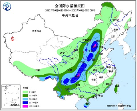 具体预报如下:今天,陕西中东部、山西、河北中西部、北京大部、河南西部、有大到暴雨,其中,河北中部偏西地区等地的局部地区有大暴雨(100~140毫米)。另外,内蒙古中部偏南地区等地的部分地区有大雨,局地有暴雨。上述地区局地并伴有短时雷暴大风等强对流天气。内蒙古中东部、甘肃、宁夏、陕西、山西、河北等地有4~5级风。