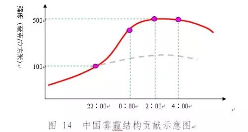 图 14虚线为假设传统雾霾浓度发展趋势,实线为微生物、水分及氨氮作用下雾霾浓度发展趋势线。冬春季节夜间气象条件有利于水份蒸腾凝结和微生物繁殖,尤其冷 空气南下造成空气水份加速凝结,极易形成严重雾霾;白天水分蒸腾作用随大气湿度增大而减弱,温度上升也使水分凝结作用减弱,使水分和氨氮减少,微生物活性 减弱,雾霾强度下降。