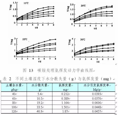 笔 者实验在低温高效热泵型蒸馏装置中进行,对土壤中提取的水在43℃进行真空蒸馏。疾控中心对蒸馏水成份进行鉴定发现,蒸馏水消除原水中矿物质和重金属等物 质,而氨氮等富营养物含量较高。这为前面论述提供有力支撑。研究表明,土壤含水量80克/千克,土壤水分散失引起氨挥发量最高 ,如表2所示。图13显示碳铵处理氨挥发动力学曲线。