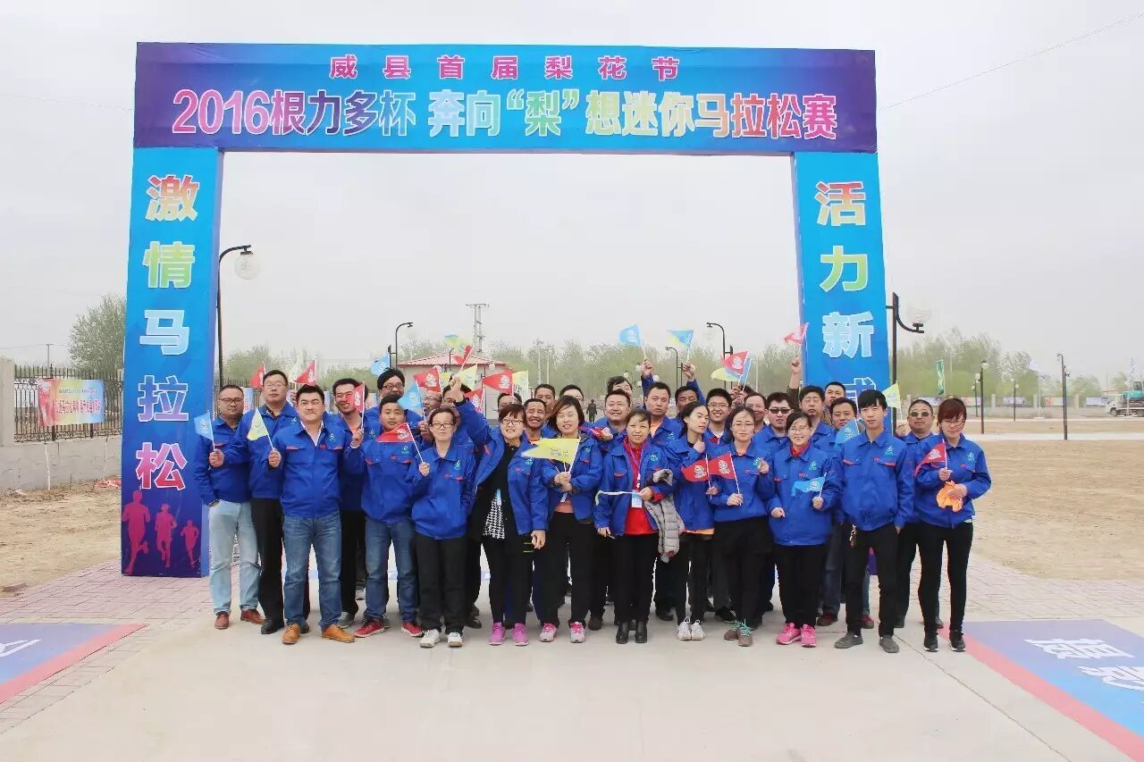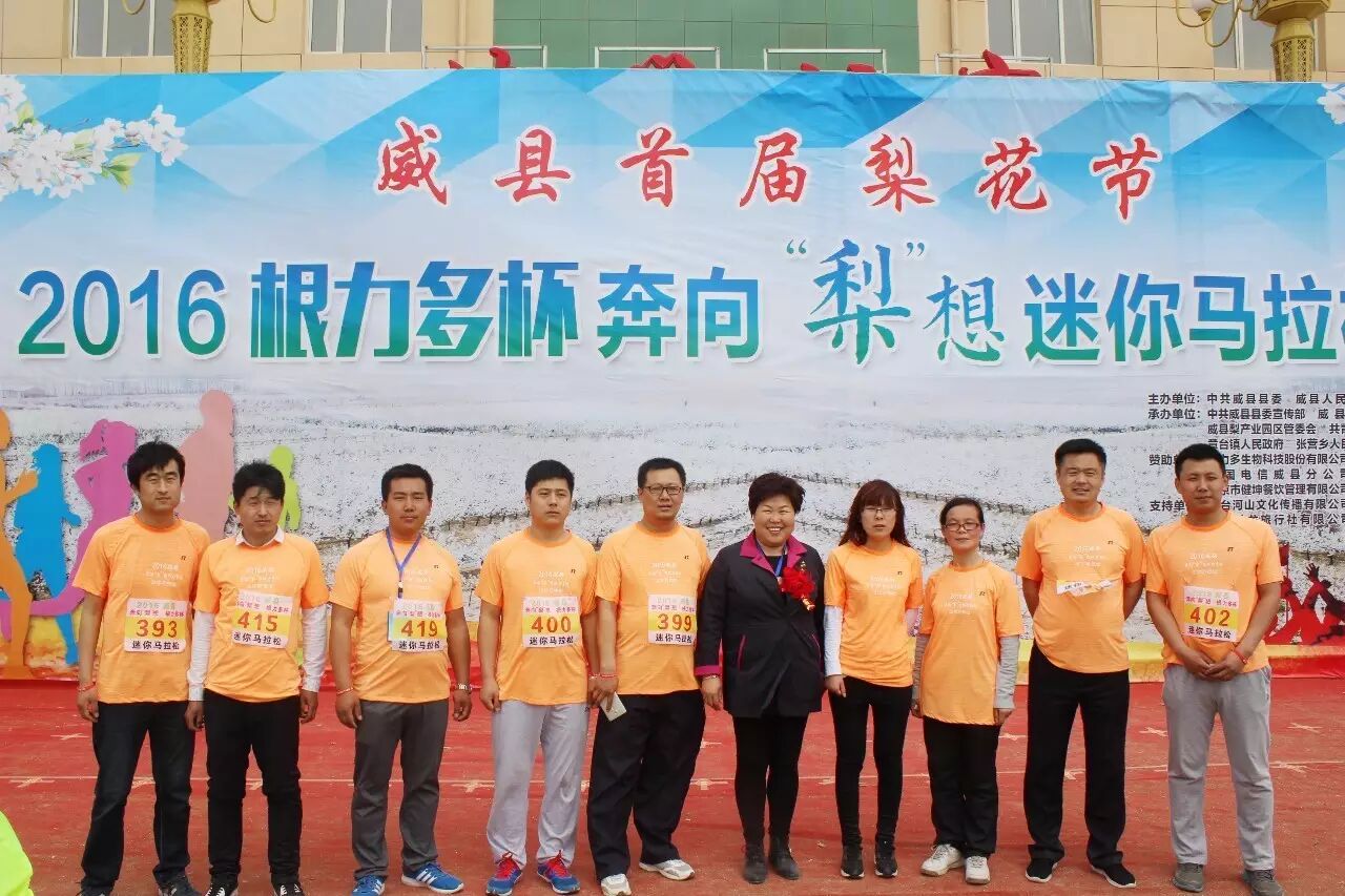 来自省市旅游局、体育局及威县四大班子领导同志,乡镇和县直部门负责人,根力多生物科技股份有限公司,邢台河山文化传播有限公司,邢台爱跑团马拉松选手,邢台市中青旅行社,新闻媒体,书画界代表,合作单位相关人员以及来自石家庄、邢台、聊城、衡水、北京、山西等地的500名运动爱好者,中国农资、农资导报、河北电视台、河北日报社、邢台电视台、邢台日报社、威县电视台等媒体界朋友,广大书画、摄影爱好者,共计1000余人参加此次活动。 根力多股份董事长王淑平在马拉松赛启动仪式上致辞,作为涉农龙头企业,能够助力此次活动,根力多人感到非常的荣幸,在今后的梨产业中,要通过根力多研发生产的高端生物有机肥料帮助农民朋友提高梨子的品质,卖出好价钱,在种植过程中若有农技问题,根力多将提供一流的农技服务专家进行现场指导。 在董事长王淑平的带领下,根力多股份100多名优秀员工变身运动健将,个个摩拳擦掌、跃跃欲试,承载着根力多股份激情、争先的企业精神,在威县县委书记安庆杰和县长商黎英的领跑下,2016根力多杯•奔向“梨”想迷你马拉松赛拉开序幕。