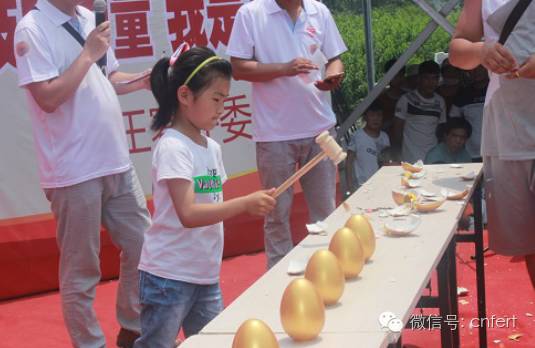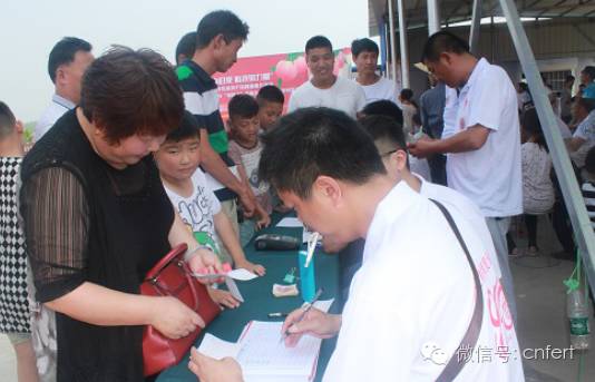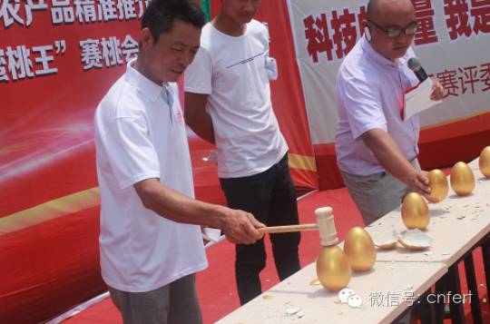 今天的重头戏“桃王大赛”在一片欢呼声中热烈展开。一颗颗品相端正、颜色艳丽的美味鲜桃,摆上了擂台,等待检验评比。经过农技专家从品相、口感等方面的认真评比,来自新沂的使用了5年“红三角”牌肥料的郝春丰家的参选蜜桃以重量和品相获得第一名,获得20袋“红三角”牌优质肥料。 砸金蛋赢大奖 现场订货气氛热烈