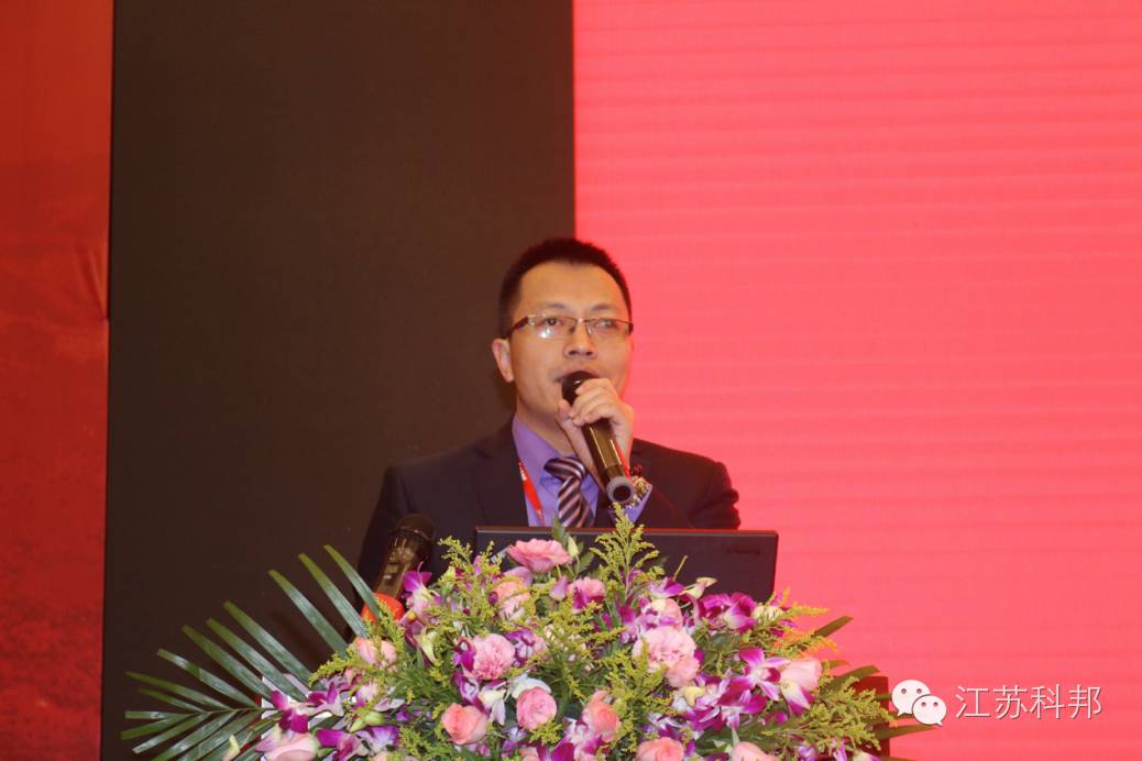 香港长江生命科技集团农业商务总监Lucas Chen在会议上重点介绍了科邦休眠生物菌的产品技术特点,并以“微生物应用与生态农业”为主题进行了分享,以详实的数据说明了微生物具有能提高土壤持水量、促进作物健康,减少病害和农药使用等等方面的作用,从而进一步讲解了生态型配方肥料具有提高养分利用率、提高作物品质和安全性、促进作物根系发达及健康生长、改善土壤理化性能等功效。 江苏科邦市场总监柯志炼 江苏科邦市场总监柯志炼发布了江苏科邦2017年三款全新产品,将会议气氛带到了新的高潮。一是科邦3维全效生物型复混肥。据介绍,该肥料首次将高效活性菌、高能生物质、高浓度氮磷钾及螯合中微量元素融为一体,开创了全效肥料的先河;二是科邦聚酶增效肥料。该产品可使肥料养分利用效率提高8个点;三是科邦嘉诚生物有机肥。该产品是国内第一款有营养配比、能根据作物的营养需要,科学搭配固氮菌、解磷菌和解钾菌比例的生物有机肥。
