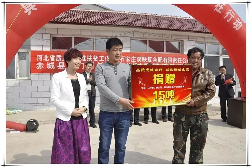 近50年来,双联人始终坚守“品质成就双联 诚信铸就永恒”的宗旨,视产品质量为生命,视农民需求为己任,勇于承担社会责任,2016年我们的爱心之花盛开正艳。 2016双联爱心历程 我公司为石家庄市赞皇县西阳泽乡石碑村送去20吨玉米专用肥料。