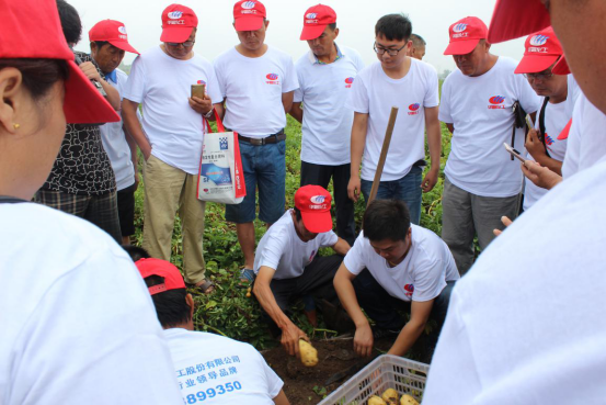 中国新型肥料网独家报道: 7月2日的青岛平度,天空飘着淅淅沥沥的小雨。虽说天公不作美,但是在当地华昌的土豆示范田里,仍然聚集起了200多人,他们有的是当地种植大户,有的是当地零售商。“华昌化工土豆套餐肥观摩会——山东平度站”在此举办。众人脚踩泥泞,亲眼见证了土豆样板田的丰产丰收。经过现场测产,示范田土豆每亩产量突破了9000斤。在当地较为干旱的气候条件下,能达到这样的产量着实是一个小小的奇迹。用数据和事实说话,当地零售商颇受鼓舞,对华昌的肥料产品也更有信心了,当天的订货环节,现场气氛热烈,订货量突破了1700吨。